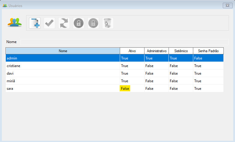 Isso mudará a informação da coluna “Ativo” deste usuário para “False“, bloqueando o mesmo. Veja a tela a seguir: