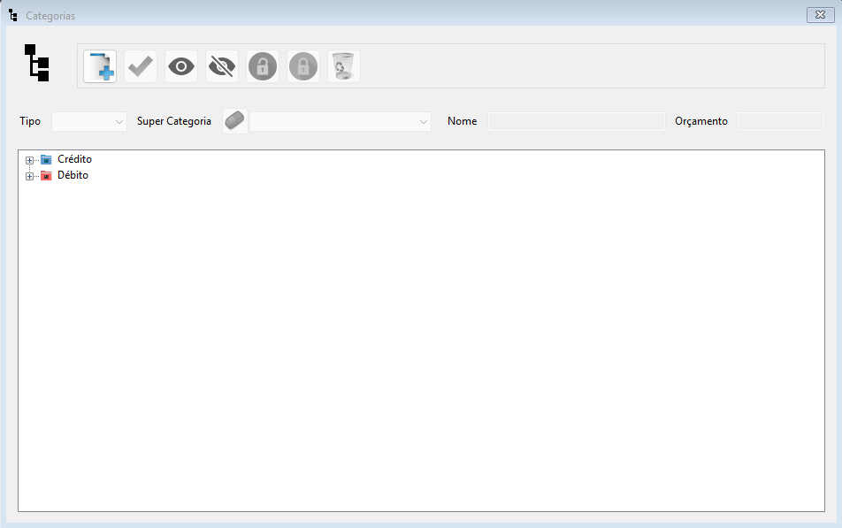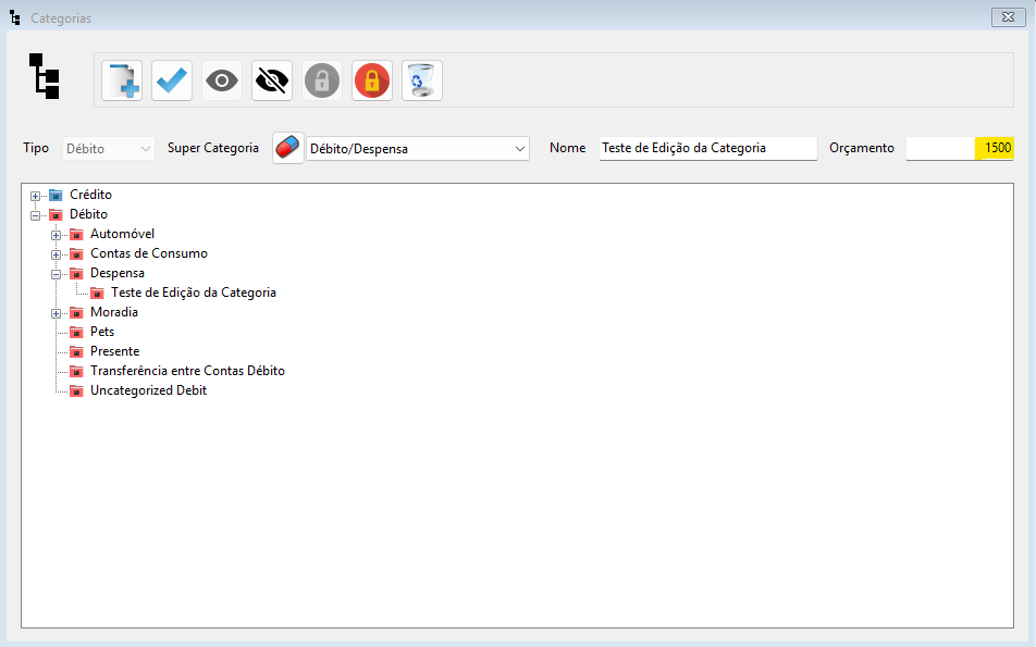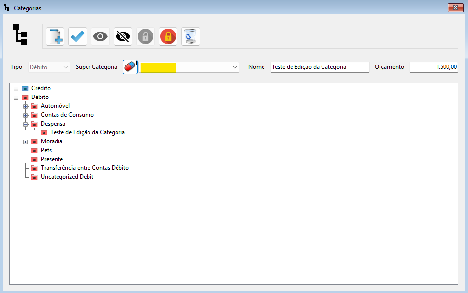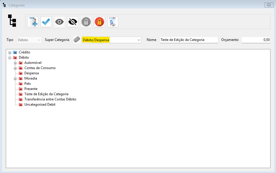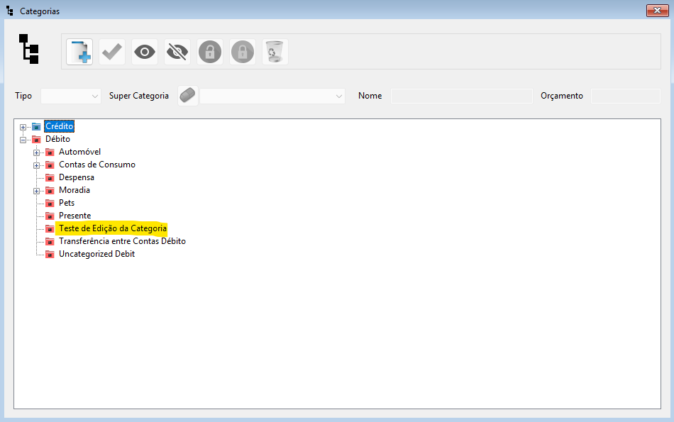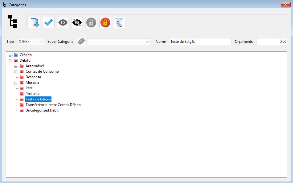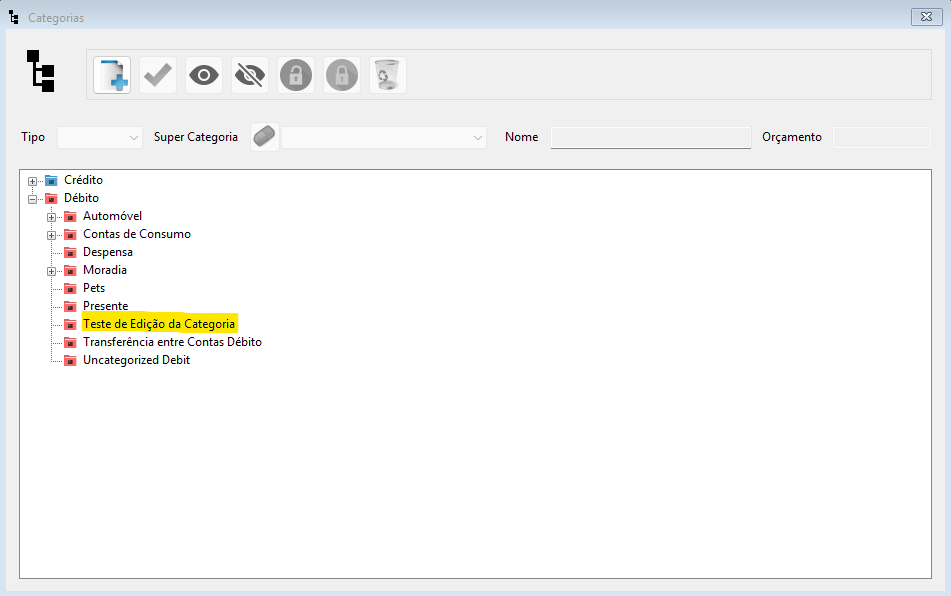 Para editar uma categoria, entre na tela de Categorias, através da opção “Categorias“ do menu do MyMoney. Abrirá a tela a seguir: