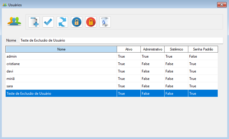Em seguida, selecione na lista de usuários o usuário que deseja excluir. No nosso exemplo: “Teste de Exclusão de Usuário“.
