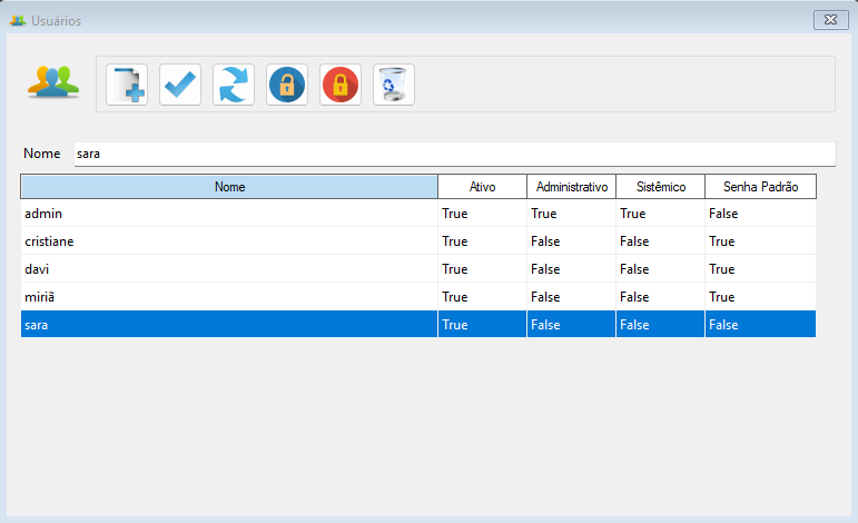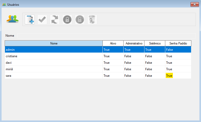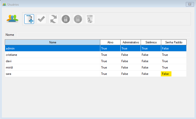 Clique no botão “Ok“. Isso mudará a informação da coluna “Senha Padrão” deste usuário para “True”, fazendo com que o usuário tenha que redefinir sua senha no próximo login. Veja a tela a seguir com a senha da “sara” resetada.
